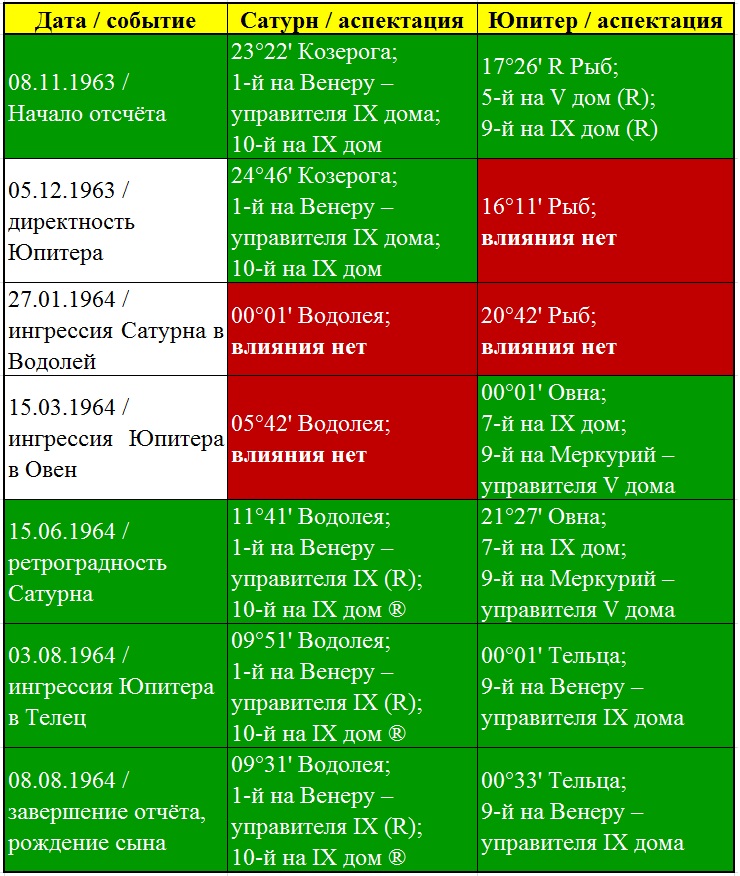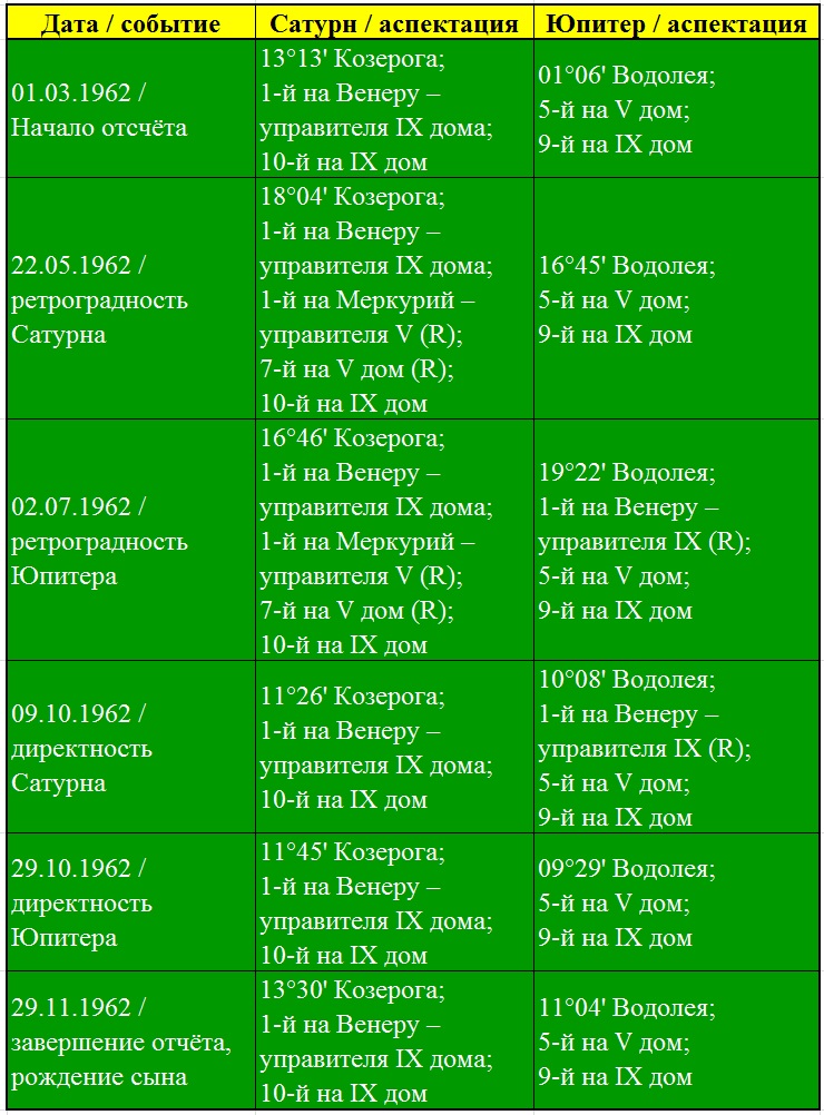 Проследим транзиты Сатурна и Юпитера за девять месяцев до его рождения, то есть с 01 марта 1962 года.