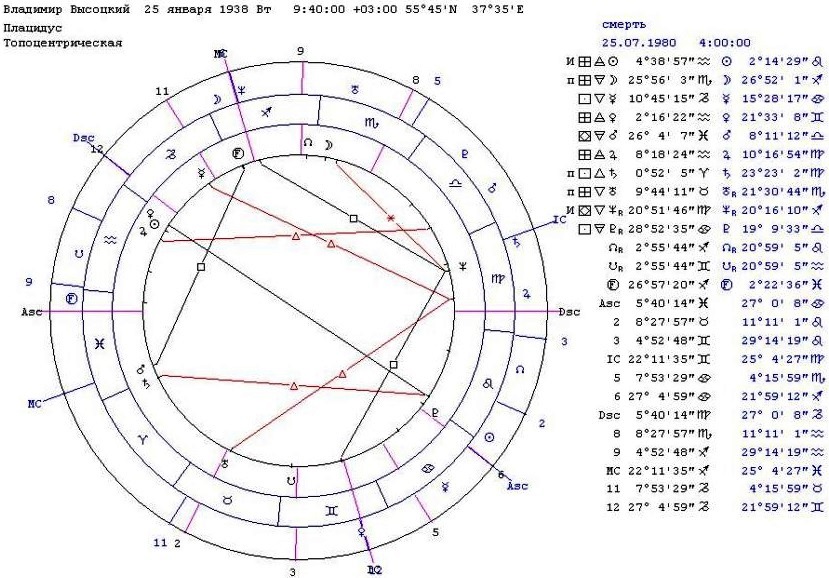 «Mors omnia solvit (Смерть решает все проблемы)», – говорили древние римляне. К транзитной карте смерти Высоцкого и обратимся, взяв за основу времени смерти 04 часа утра.