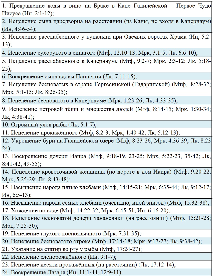 При этом чудеса укрощения бури (пункт 12 списка), хождения по воде (пункт 17 списка) и со статиром (пункт 21 списка) выделяются на общем фоне и не принадлежат какой-либо одной группе.