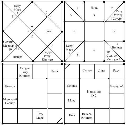 В нашем примере, ось XI – V дома опять же представлена расположением в V доме Солнца и Меркурия. Солнце при этом управляет одним из «домов Веры», XII домом, а Меркурий – личными I и X домом. В X же доме, опять же, присутствует управитель XI дома – Луна с партильным секстилем от Юпитера.