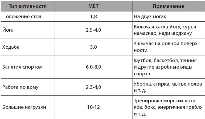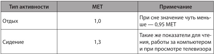 Часто энергетические затраты выражаются в метаболических эквивалентах (MET). Один MET определяется как 1 килокалория на килограмм массы тела в час, грубо говоря, затраты энергии во время отдыха. Существует так называемый «Компендиум физической активности». Он составляется с 1993 года Барбарой Эйнсворт и ее командой и считается авторитетным источником, к которому можно обратиться за тем, чтобы узнать об энергозатратности конкретной деятельности. В нем описаны показания для более чем восьмисот видов активности, от повседневных (печатание на машинке или компьютере, 1,3 MET) до неожиданных (рыбалка с копьем стоя, 2,3 MET) и от любопытно неопределенных (сексуальная активность, общие умеренные усилия, 1,8 MET) до обескураживающе специфических (ходьба задом наперед, со скоростью 5,5 км/час, подъем в гору, 5-ти процентный наклон, 6,0 MET). Я перечислил некоторые общие виды деятельности и их энергозатратность в таблице 3.1.