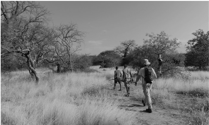 Рис. 3.1. Прогулка пешком. Работать и жить в племени хадза означает постоянно быть на ногах и проходить много километров пешком. На этой фотографии вы видите, как мы следовали за двумя членами племени, выслеживающими импалу, подстреленную два часа назад. Несмотря на все усилия, отпечатки копыт и пятна засохшей крови, антилопу так и не нашли.
