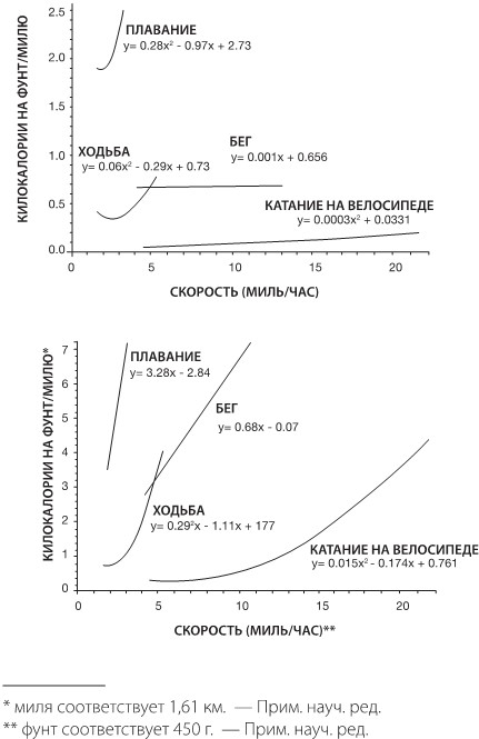 Получается, что 70-килограммовый человек, пробежавший километр, сожжет 66 ккал (0,95 × 70 = 66). И поскольку 70 кг – это типичный вес для взрослого человека, то мы можем смело предположить, что ходьба требует 34 ккал за км, а бег – 66 ккал. Бег «стоит» вдвое дороже, чем ходьба, но все же далеко не так дорого, как плавание. В исследованиях профессиональных пловцов Паолы Зампаро, Карло Капелли и их коллег энергозатраты на плавание рассчитываются следующим образом: