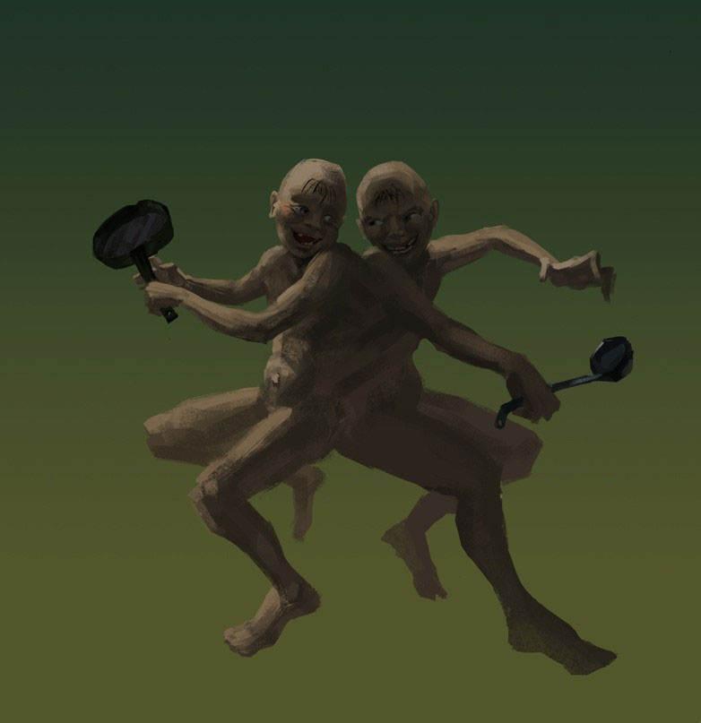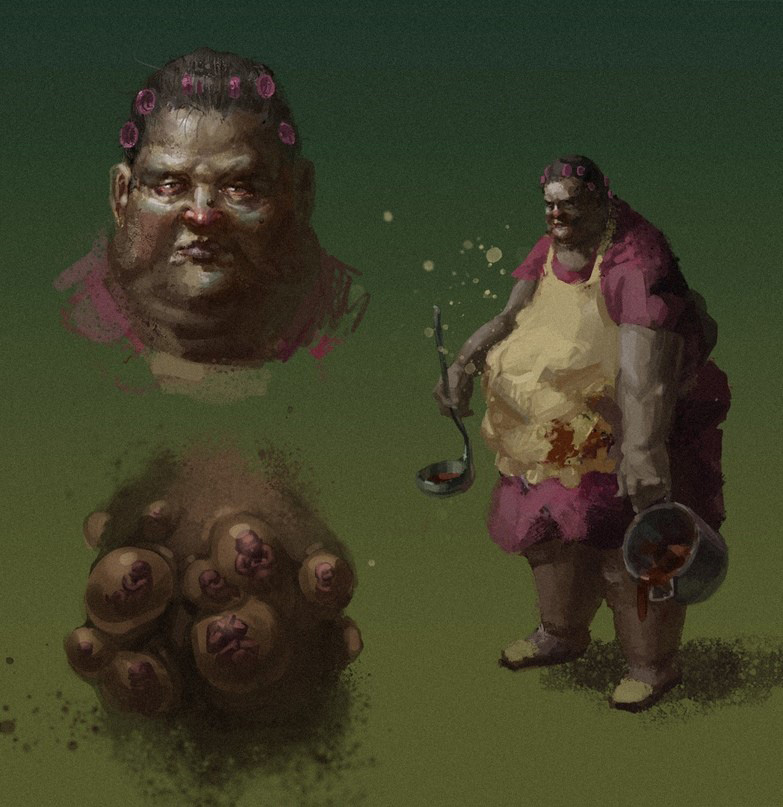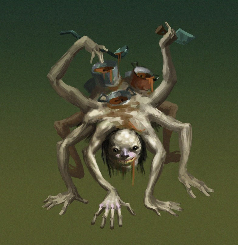 Оно что-то проквакало вопросительно, не прекращая помешивать половником бурое варево в одной из многочисленных кастрюлек, росших у твари прямо из спины. Перебирая бессчетными обезьяньими лапами по полу, нечто подошло ко мне поближе и снова зашевелило уродливой, разделенной надвое поперек челюстью. Кваканье повторилось, уже с нажимом. Множественные пузырчатые глаза, слепленные в черные комья, пялились на меня, лишенные всякого выражения. Одна из лап потянулась за спину, зачерпнула пальцем кипящей дряни и отправила каплю в рот, после чего тварь замычала – горестно и отчаянно.