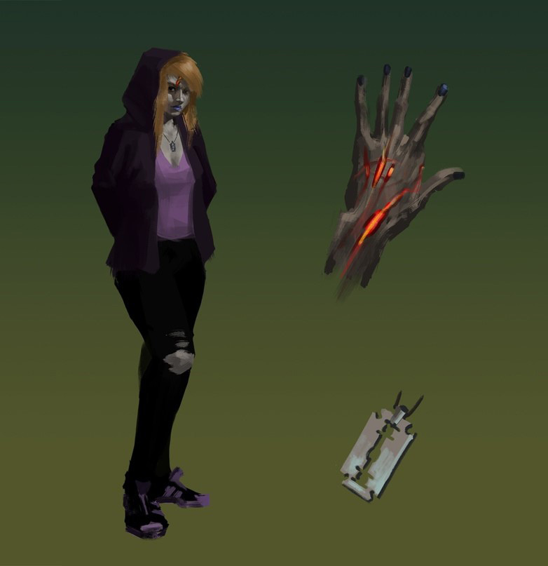 Уродкой она, конечно же, не была. Обычная девчонка, чуть младше меня. Рыжие волосы торчали сальными прядями из-под капюшона, лицо измазано какой-то сажей, одета в джинсы и куртку из искусственной кожи. На тонкой белой шее болталось бритвенное лезвие на тонкой цепочке. В руке зажат заостренный кусок жести.
