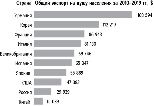 Китай обошел Германию в качестве мирового лидера по экспорту в 2009 году и с тех пор занимает первое место. США тоже обогнали Германию по общим продажам. Однако экономика этих двух стран во много раз крупнее экономики Германии. Выдающиеся результаты по экспорту немецких компаний четко видны, если сравнивать данные на душу населения (рис. 2.2).