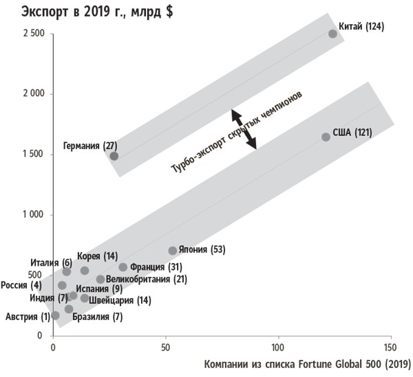 Гипотеза о том, что крупные компании определяют результаты экспорта страны, верна для большинства стран. Можно выделить практически линейное соотношение между количеством крупных корпораций и результатами экспорта в США, Японии, Франции, Корее, Великобритании, Италии и Испании. Только Китай и Германия отходят от этого правила – именно те две страны, которые занимают лидирующие позиции по общему экспорту и экспорту на душу населения соответственно. Китай и Германия отличаются как небо и земля, что же у них может быть общего? В Китае около двух третей всего экспорта приходится на средние предприятия, и в Германии примерно такая же доля экспорта МСБ[14]. Не каждое малое и среднее предприятие занимается экспортом, а значит, существует высокая вероятность того, что скрытые чемпионы – основная движущая сила впечатляющих результатов Германии. Фонд скрытых чемпионов в Сингапуре подтверждает этот вывод: «Скрытые чемпионы представляют собой стержень немецкой несокрушимой экономики, ориентированной на экспорт. Их корни следует искать в командном духе немецкого Mittelstand»[15].