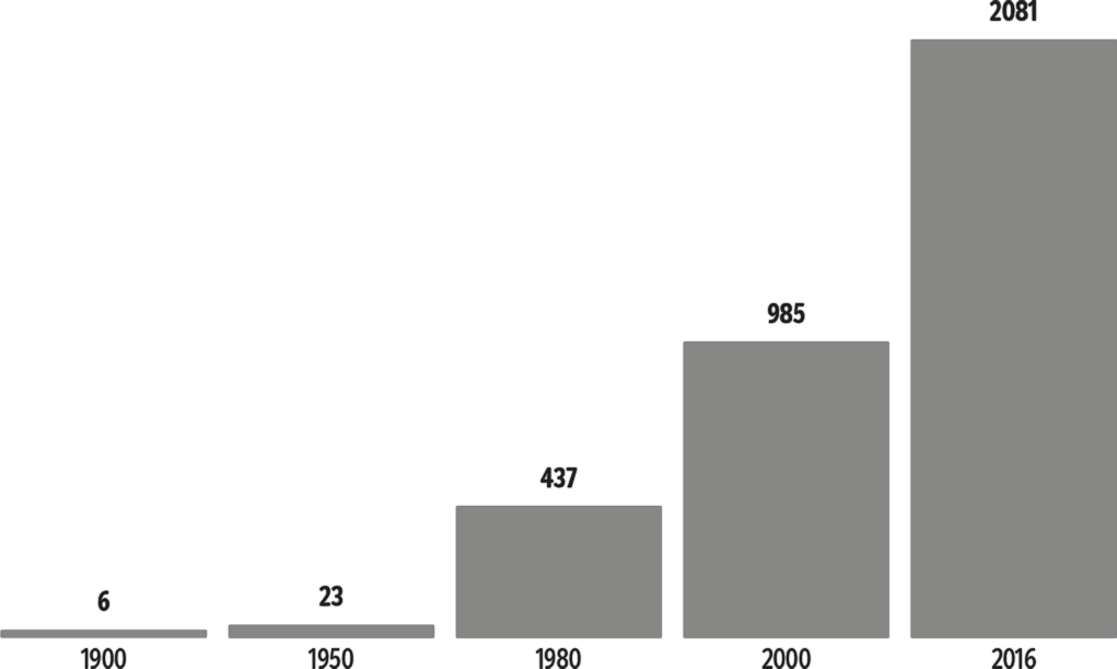 В абсолютных цифрах такое развитие означает подъем международного товарообмена от $9,9 млрд в 1900 г. (тогда население мира насчитывало 1,65 млрд человек) до $15500 млрд в 2016 г. (при населении мира 7,47 млрд человек). Таким образом, международный товарообмен к 2016 г. вырос в 1566 раз по сравнению с 1900 г. Это при том, что здесь не учитываются прямые капиталовложения и экспорт услуг (например, финансовые услуги, разработка программного обеспечения или находящиеся за рубежом телефонные сервисные центры). Вероятно, при их учете рост еще бы удвоился. Другие показатели – свидетельства глобализации – выросли за последние 30 лет еще больше, чем в сфере экспорта, например, зарубежные финансовые операции, которые только с 1980 г. возросли более чем в девять раз, число иностранных туристов к 2013 г. увеличилось в шесть раз[2].
