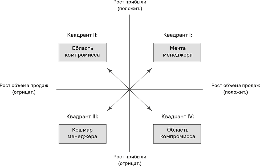 Эту проблему иллюстрирует рис. 2.1. Рост прибыли показан по вертикальной оси, рост объема – по горизонтальной. Пересечение осей обозначает статус-кво.