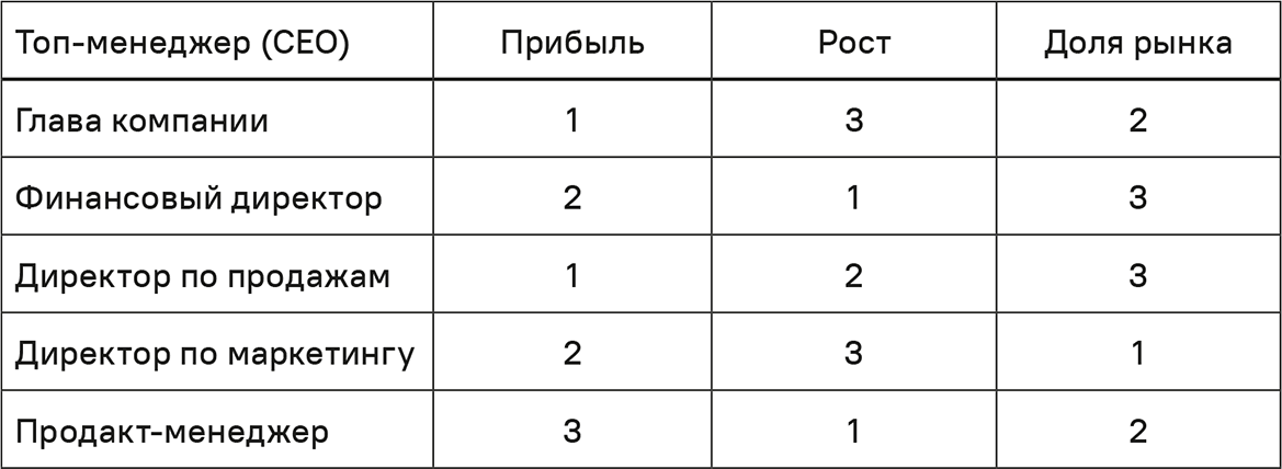 В табл. 2.1 показан пример слабо согласованных между собой целей отдельных менеджеров. CEO и директор по продажам согласны, что прибыль важнее роста или рыночной доли, а финансовый директор считает рост высшим приоритетом. Для директора по маркетингу самое важное – это доля рынка. По нашему опыту, мало кто из руководителей явным образом извлекает прибыль из своей главной цели, несмотря на данные из табл. 2.1. Таблица отражает их фактическое поведение, а совсем необязательно то, что они заявляют официально на встречах с инвесторами или на ежегодных собраниях акционеров. Фундаментальные цели – маржа, доход на единицу продукции, итоговая прибыль – часто не оправдывают ожиданий. Член совета директоров известной компании-автопроизводителя отлично выразил эту идею: «Если наша доля рынка сократится на 0,1 %, покатятся чьи-то головы. А вот если прибыль упадет на 20 %, никто особо не печалится». Хотя не стоит целиком принимать эти слова за чистую монету, они неплохо обрисовывают самую суть важной для бизнеса проблемы: цели по доходам, объемам и рыночным долям – а не по прибыльности – очень часто определяют повседневную деятельность.
