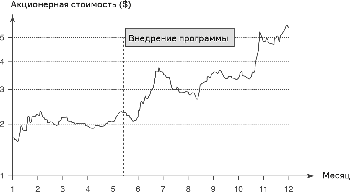 Когда компания обнародовала первые успехи данной стратегии на пресс-конференции, посвященной квартальной прибыли, стоимость ее ценных бумаг в тот же день резко пошла вверх. Некоторые из конкурентов последовали ее примеру и внедрили собственные формы ценовой дисциплины. Итоговый результат – настоящий классический пример компании, практикующей ценовое лидерство. Цена акций компании за полгода выросла вдвое. На рис. 2.3 представлены подвижки курсовой стоимости после старта программы ценовой дисциплины [16]. Глава компании отдал должное позитивной реакции фондового рынка, сказав: «Мы очень довольны результатами дисциплинированного отношения к ценообразованию. Они отражают положительную динамику нашей индустрии, куда входит и снижение ценового прессинга». Инвестиционные аналитики также не поскупились на хвалебные отклики в адрес новообретенной ценовой дисциплины. «Повышение оптовых цен отражает тренд ослабления ценового прессинга – очень позитивная подвижка. Стабильные цены пойдут на пользу всем игрокам на рынке» – говорилось в одном докладе.