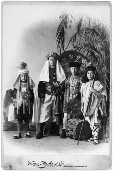 Братья Шолемы в восточных костюмах. Слева направо: Герхард (Гершом), Райнхольд, Эрих и Вернер. На свадьбе дяди Теобальда Шолема. Берлин. Сер. 1900-х
