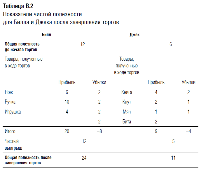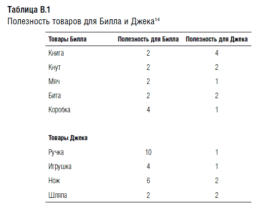 Нэш совершено справедливо полагает, что игроки будут обменивать те товары, которые они ценят меньше, на те, которые представляют для них большую ценность. Учитывая, что Билл и Джек обладают полной информацией о предпочтениях друг друга, ни один из них не может обманом заставить другого «заплатить» за какой-либо товар больше, так как им известно, какой полезностью обладают все товары для каждого из них. Исходя из этого, мы можем смоделировать ситуацию «равновесия по Нэшу» для Билла и Джека (см. табл. В .2).