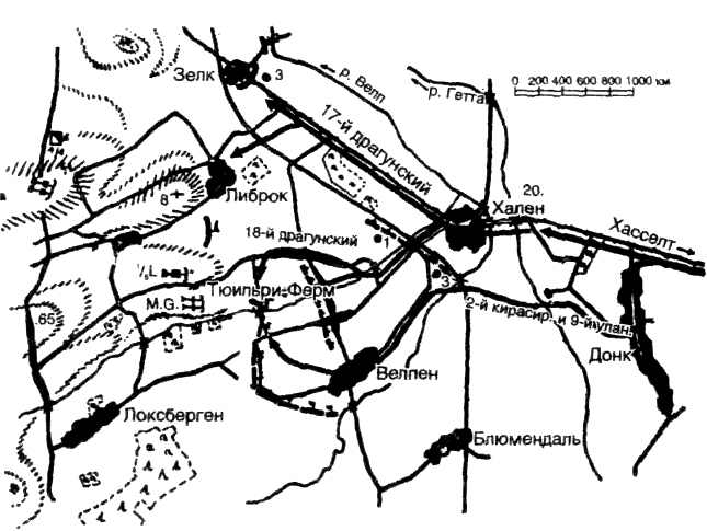 Тем временем наша артиллерия сумела занять позицию западнее Халена и открыла огонь по вражеским батареям в Хотеме. Немцы надеялись подавить огонь бельгийской артиллерии настолько, чтобы позволить 18-му драгунскому полку, в свою очередь, миновать Хален, а затем, выйдя на открытое пространство через проход, ведущий на юго-запад к Велпену, во весь опор атаковать высоты. Развертывание в боевой порядок из колонны по два должно было происходить под сплошным ружейным и пулеметным огнем. С развевающимися знаменами немцы бросились вперед, причем два эскадрона образовали первую линию атаки, а третий шел за ними слева вторым эшелоном, и тут же лавина всадников пронеслась через передовые линии вражеских стрелков. Однако затем атака захлебнулась, – на нее внезапно обрушился яростный заградительный огонь, вспыхнувший за полосой кустарников и колючей проволоки. Потери немцев были чрезвычайно высоки.