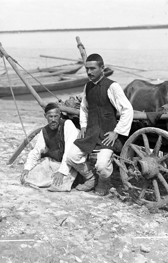 Виноградов З. З. Два татарина возле телеги на берегу Волги у деревни Козловка близ Казани. Негатив. 1913