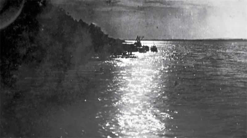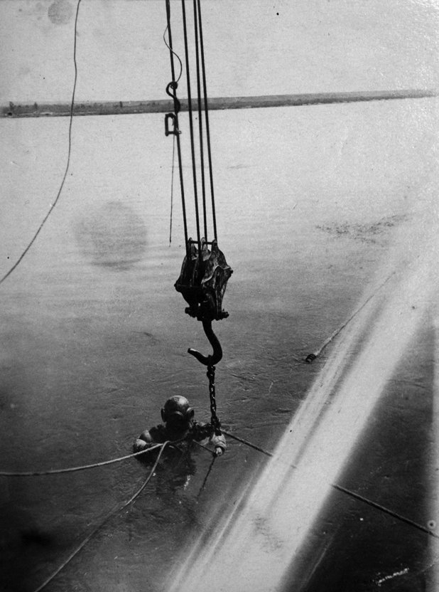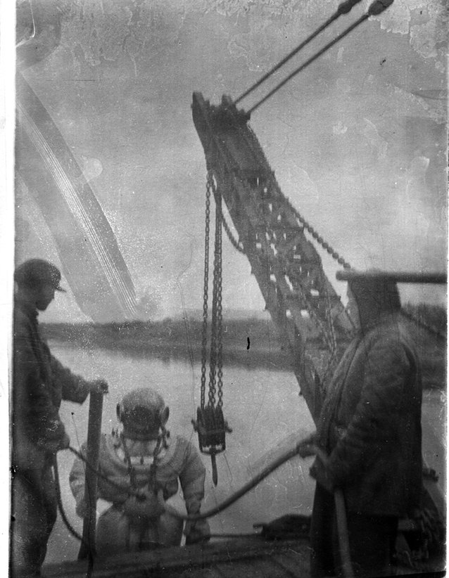 Автор неизвестен. Момент спуска водолаза в воду. Из коллекции фотографий работ по прокладке подводного телеграфно-телефонного кабеля через реки Вятку, Каму и Волгу за 1931, 1936, 1938 годы. 1936