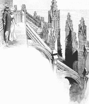 На мгновение их, однако, отвлекла заключенная в арке кружевная лестница, перекинутая прямо по воздуху от одной башенки к другой, словно для того, чтобы взбираться на облака. И снова они были изумлены, когда дошли до «Тропы безумцев» – головокружительной гранитной дорожки без перил, которая вьется почти до самой вершины последней башни.