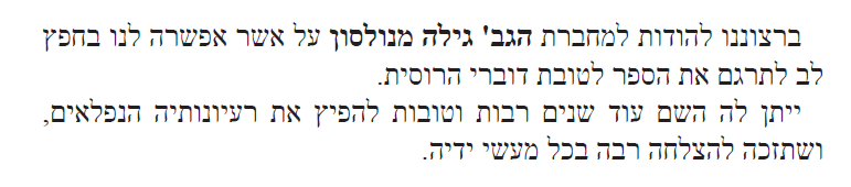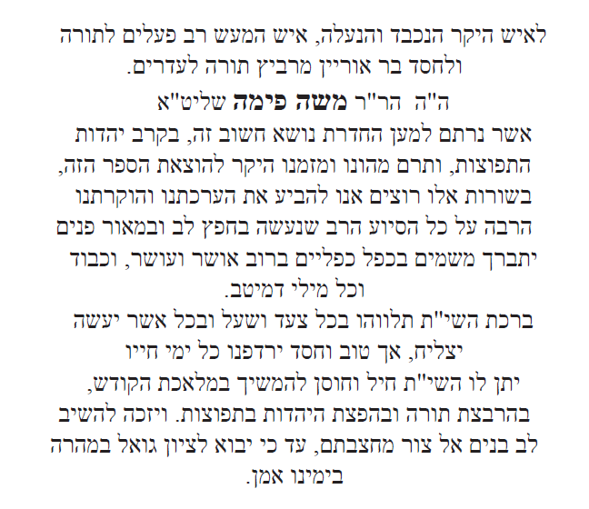 нашему дорогому и многоуважаемому другу, раву Моше Фима, да продлятся его годы, который спонсировал издание этой книги.