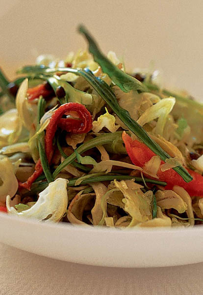 When we make this dish, we usually discard the outer leaves of the puntarelle, but, if you like, you can keep them to serve as an accompaniment to fish or meat, especially barbecued meat. Blanch the leaves briefly in boiling salted water, then drain, chop and sauté in a little olive oil. Mix with some toasted pine nuts and some sultanas that have been soaked in water for half an hour or so to plump them up. You could even add the mixture to this salad – spoon it on to your plates first, then arrange the salad on top.