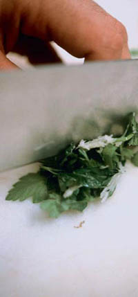 Every morning in the restaurant kitchen, one of our jobs is to chop parsley and garlic, ready to sprinkle into dishes whenever needed. We put the garlic cloves on a chopping board and squash them to a rough paste with the back of a knife. Then we put the parsley on top and chop it quite finely, so that the crushed garlic is chopped too. That way the garlic becomes almost a pulp, and it releases its flavours into the parsley and vice versa.
