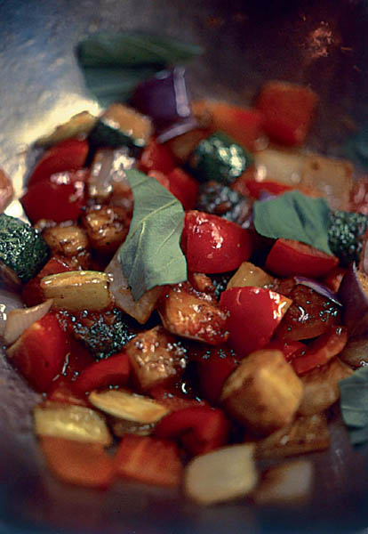 Tear the basil leaves and add them to the bowl with all the rest of the ingredients, seasoning well. Cover the bowl with cling film while the vegetables are still warm and leave to infuse for at least 2 hours before serving at room temperature. Don’t put it in the fridge or you will dull the flavours. It is this process of ‘steaming’ inside the cling film and cooling down very slowly that changes caponata from a kind of fried vegetable salad, with lots of different tastes, to something with a more unified, distinctive flavour.