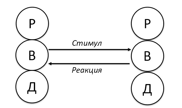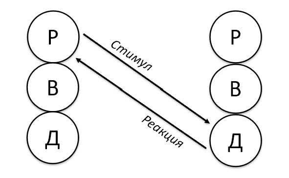 2. Реакция: Из какого эго-состояния (Р, В или Д) второго человека исходит реакция? К какому эго-состоянию (Р, В или Д) первого человека она адресована?