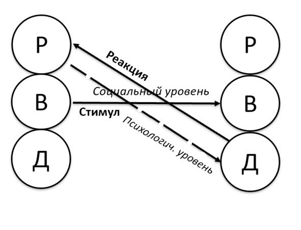 1. Стимул на социальном уровне обычно идет от одного эго-состояния отправителя (часто Взрослого) к одному эго-состоянию получателя (тоже часто Взрослому). Этот уровень выглядит как вполне рациональный обмен информацией или деловое предложение.