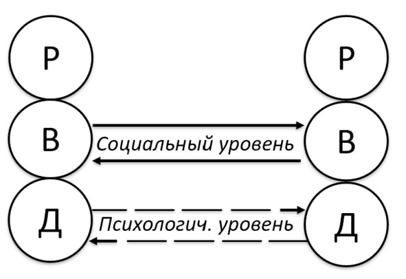 1. На социальном уровне происходит видимый, часто вполне приемлемый обмен стимулом и реакцией между одной парой эго-состояний (например, Взрослый ⇄ Взрослый).