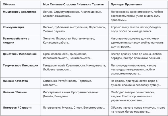 · Врожденные Сильные Стороны (Strengths): Ваши природные склонности, то, что вам дается легко и приносит удовлетворение (например, эмпатия, логика, креативность, коммуникабельность, стратегическое мышление, оптимизм).