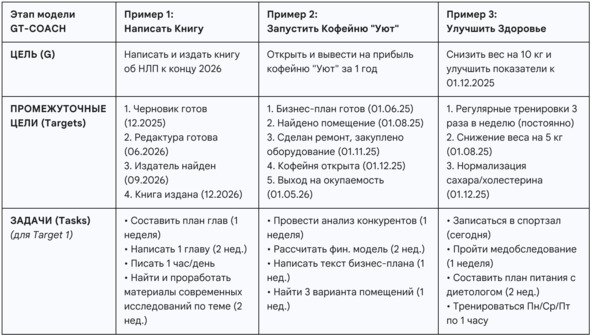 · SMART: Как мы помним из Главы 3, этот акроним (Конкретный, Измеримый, Достижимый, Релевантный, Ограниченный по времени) отлично подходит для формулировки как основной Цели (G), так и Промежуточных Целей (T). Для Задач (Tasks) часто достаточно Конкретности (что сделать?) и Ограниченности по времени (к какому сроку?).