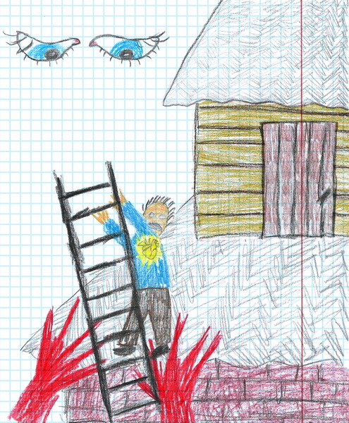 Владимир явно не ожидал увидеть ничего подобного – на рисунке был изображен он сам на крыше дома с деревянной лестницей в руках, а снизу к нему тянулись непропорционально большие и длинные руки красного цвета. А в углу рисунка были нарисованы большие человеческие глаза, словно наблюдающие за всем этим. Причем нарисовано всё это было довольно узнаваемо.