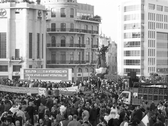 Активисты поддерживают порядок и дистанцию между шеренгами. Стильные молодые люди улыбаются, старики в красно-белых кофиах серьезны. Активистам все труднее сдерживать хаос. Кругом баннеры, проклинающие резолюцию: «1559 go to hell!», «Resolution 1559 is an interference with Lebanese affairs and against international law».