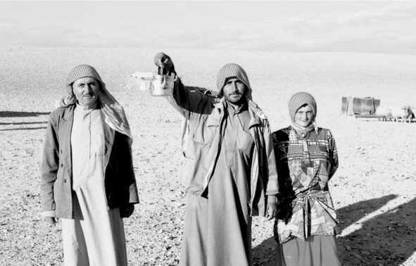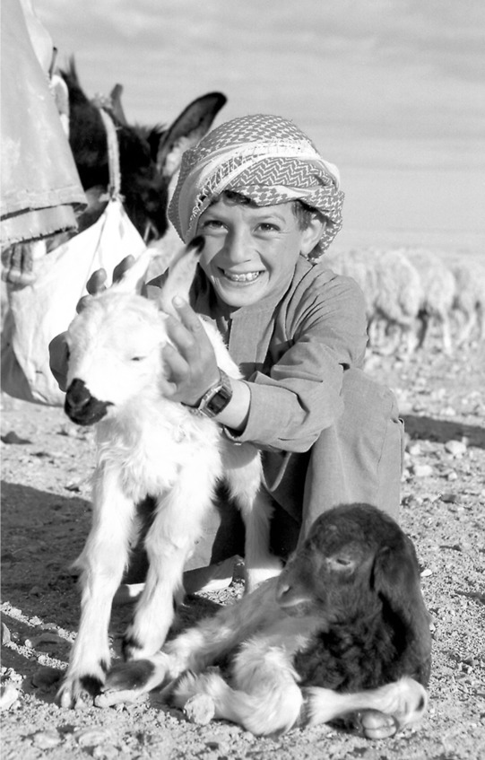Небольшой серый шатер из толстой верблюжьей шерсти. Рядом высится грузовик, в котором бедуины переезжают с места на место и перевозят скот. На бежевой твердой земле вокруг шатра чернеют круглые резиновые корытца. Это кормушки для овец. Маленький ягненок с переломанной при рождении ногой дергается на шерстяной подстилке и печально блеет. Хозяин – серьезный мужчина с темным обветренным небритым лицом, с красно-желтыми руками (видимо, от постоянного курения самокруток и от частых контактов с глиной), в красной кофии и длинной коричневой рубахе, поверх которой – безрукавка с V-образном вырезом.