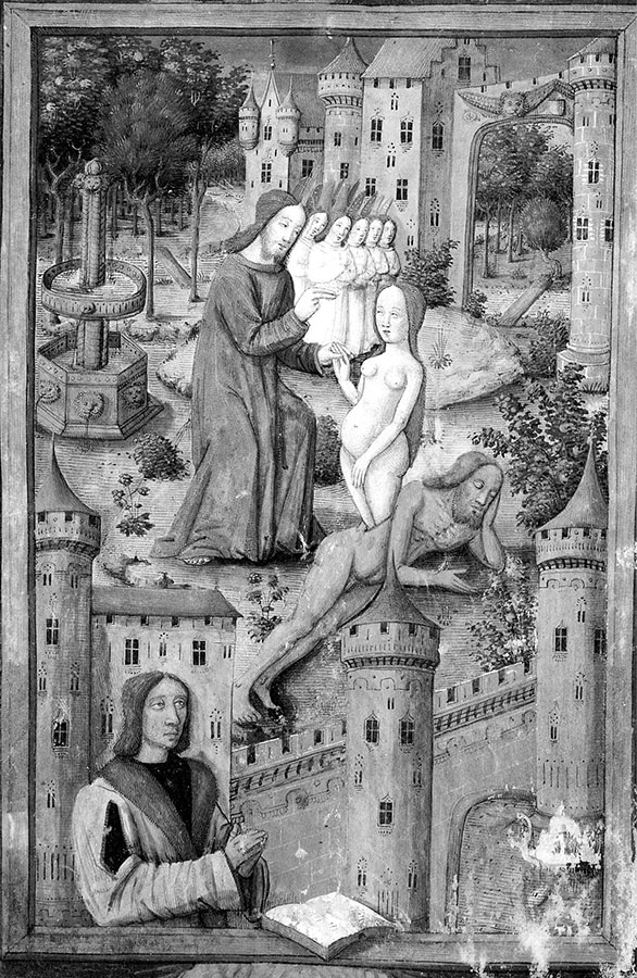 Рис. 7. Миниатюра «Сотворение Евы» из: Livre d’heures dit de Louis d’Orle’ans (Horae ad Usum Romanum). Bourges, Toulouse. Якобы около 1490 года. Ева появляется из разреза на боку Адама. Взято из [1485], с. 181, илл. 218.