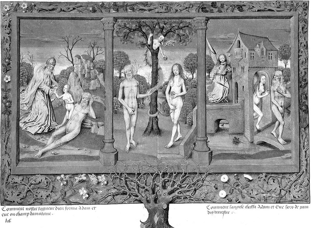 Рис. 8. Миниатюра, иллюстрирующая сотворение Евы, грехопадение и изгнание Адама и Евы из Рая. Ева появляется из разреза на боку Адама. Chronologie universelle. Flandern (Brügge). Якобы около 1480 года. Взято из [1485], с. 280, илл. 364.