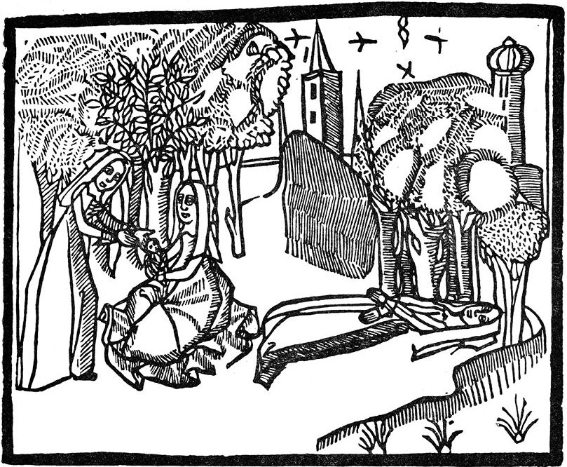 Рис. 9. Рождение Тристана. Гравюра на дереве из первого издания книги Т. Мэлори «Смерть Артура», якобы 1485 год. Взято из [469:00], вклейка между с. 224–225.