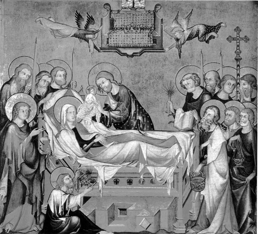 Рис. 11. Успение Марии Богоматери. Клюстернойбургский алтарь. Якобы около 1331 года. Рядом с Марией стоит Христос с маленькой фигуркой на руках. Фигурка как бы появляется из Марии. Взято из [927:1], илл. 52.