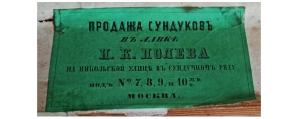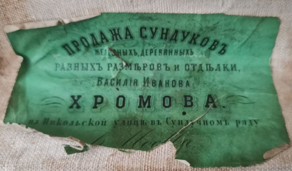 Рекламная этикетка сундучной лавки братьев Широковых. Текст: «Торговля сундуков разной отделки своего (?) изделия братьев Широковых в Москве. Старый Гостиный Двор, лав. №164, вход с Ильинки и Хрустального ряда».