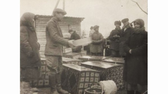 Фото. На Ветлужском базаре, 1940 г. Торговля сундуками, решётами (коллекция ВКМ, № ВТМ 4084).
