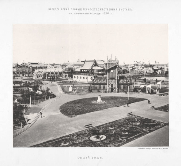 XVI Всероссийская промышленная и художественная выставка проходила в Нижнем Новгороде с 28 мая (9 июня) по 1 (13) октября 1896 года (ил. 1). Ее целями было оценить успехи, достигнутые русской промышленностью, сблизить потребителя и производителя, расширить рынки сбыта. При этом она должна была «явиться… правильно и возможно полно организованным дополнением ярмарки»24. Ю. А. Никитин писал: «Нижегородская выставка стала важным событием общественно-экономической и культурной жизни страны. Она оказала благотворное влияние на развитие промышленности, сельского хозяйства, торговли, способствовала техническому и социальному прогрессу»25. Общее количество экспонентов составило 8562 человека. Для строительства выставочного городка казной было выделено 3094340 рублей. Вся сумма казенных издержек, связанных с выставкой, доходила до 8,8 млн. рублей26. В городе тщательно подготовились к этом «промышленному смотру»: построили здания драмтеатра, суда, биржи Волго-Камского банка, гостиниц, пустили первый в России электрический трамвай, устроили фуникулеры. Н. Ф. Филатов отмечал: «Подобное градостроительное переустройство во многовековой истории Нижнего Новгорода сопоставимо лишь с 1780-ми годами, когда он изменил средневековую структуру, был впервые перепланирован на регулярной основе и практически заново отстроен»27. Одновременно с выставкой был проведен Всероссийский промышленный съезд, в котором приняло участие 800 представителей торговли и промышленности.
