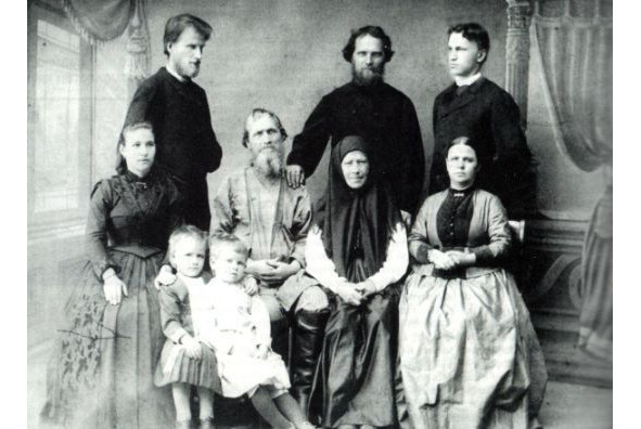 Семья Огибениных. Стоят: Иоиль, Макар, Тарас, сидят: Климентий Трофимович с женой, невестками и внучками (1881).