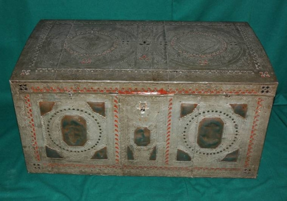 Известно, что крестьяне Верхотурского уезда в конце XVIII – начале XIX века (возможно, и ранее) делали сундуки из липового, ольхового, осинового, иногда соснового «самосушного» дерева и оковывали их железом. Для оковки сундуки в уезд привозили на 6— 7 тысяч рублей «белаго луженаго, чернаго Баташевского, немецкаго бочечнаго и английскаго шлифованнаго железа». Окованные железом и снабженные замками сундуки размером в 7 четвертей продавались на Макарьевской и Ирбитской ярмарках по 7—8 рублей»33. Кроме того, в конце XVIII – начале XIX века в Верхотурский уезд с различных ярмарок привозились краски не только для написания икон, росписей подносов, но и «крашения сундуков»34.