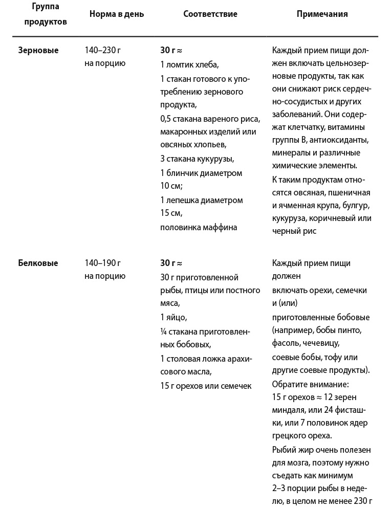 * «Диетические рекомендации для американцев» за 2015–2020 гг. На сайте www.ChooseMyPlate.gov вы найдете подробные рекомендации и множество другой практической информации о питании и физической активности. Указанные выше нормы, за исключением молочных продуктов, варьируются в зависимости от возраста, пола и физической активности. Норма потребления предложена при условии суточного расхода от 1600 до 2400 калорий. Однако молодому и активному мужчине, скорее всего, стоит потреблять больше, чем рекомендовано в таблице.