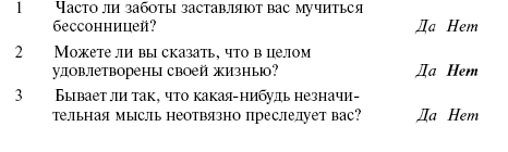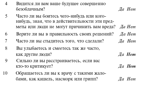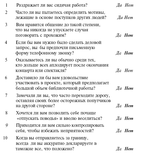 Отвечая на вопросы, постарайтесь все же заставить себя сказать «да» или «нет», как бы ни было трудно принять решение. Постарайтесь быть честным, но не слишком уж ломайте голову над точным смыслом каждого конкретного вопроса: результат будет учитывать общую картину ваших ответов, т. е. их общий разброс, а не каждый из них в отдельности.