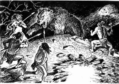 В начале марта меня разбудили панические крики. Поняв, что происходит нечто страшное, я, даже не думая об опасности, выскочил из своего домика. В слабом свете еле горевшего костра племя врассыпную разбегалось от пещеры, в которую лез проснувшийся после голодной зимы здоровенный медведь. Я схватил охапку заготовленных сухих крапивных волокон и бросил в костер. Пламя резко осветило площадку около пещеры, и косолапый испугано шарахнулся в сторону. Мое появление несколько успокоило дикарей, и мужчины стали окружать хищника, обращая в его сторону копья. Медведь рычал и огрызался, решительно отбивая лапой робкие попытки ткнуть его оружием. В какой-то момент он бросился на прорыв, повалив одного из дикарей и мгновенно вцепившись в него жуткой клыкастой пастью. Пользуясь тем, что хищник на секунду отвлекся, Тыкто подскочил сзади и с размаху ударил топором по медвежьему затылку. Топор разломился, камень с хрустом отлетел, но удар оказался оглушающим. Потапыч обмяк, и дикари моментально добили его копьями.