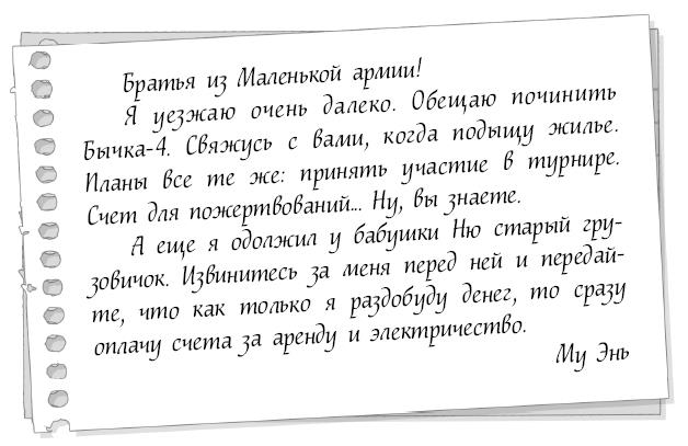 Он активировал вспомогательную систему двигателя Бычка-4 и тихонько отбуксировал его на лужайку. На задворках старого склада парень нашел старый грузовичок бабушки Ню, которым та больше не пользовалась, и погрузил на него Бычка-4 с механическими котами. К железному стеллажу, стоявшему на самом видном месте посреди склада, Му Энь прикрепил записку: