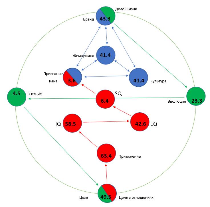 Парные по ключам сферы: это Дело Жизни / Эволюция, и сферы Сияние / Цель. В каждой из этих пар стоят ключи – программные партнёры, и в этих парах одинаковые линии.