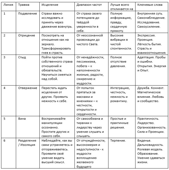 Линии, в отличие от ключей, в одних сферах имеют только Дар, в других сферах – и Дар, и Тень. Каждая линия имеет свою неизменную суть, которая преломляется в зависимости от содержания сферы и раскрывается новыми гранями. Основная суть линий отражена в таблице ниже: