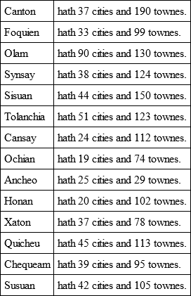 The names of the fifteene prouinces are as followeth: – Paguia,29 Foquiem,30 Olam,31 Sinsay,32 Sisuam,33 Tolanchia,34 Cansay,35 Oquiam,36 Aucheo,37 Honan,38 Xanton,39 Quicheu,40 Chequeam,41 Susuam,42 and Saxij.43 Almost all these prouinces, but in particular tenne of them which are alongst the sea costs, are full of deepe riuers of sweete water and navigable, vpon whose branches are situated many cities and townes, whereof you may not onely haue the number of them, but also their names: for that these Chinos are so curious people, that in their books are named besides the cities and townes, the banketing houses and houses of pleasure, which the gentlemen haue for their recreation. And for that it will be more trouble than profite to inlarge any further in this matter, I will refer it vnto the next chapter, where I will intreate of the cities and townes that either of these prouinces hath, and pass ouer all the rest, as not necessarie; for our intent is to set forth the bignes of this kingdome.