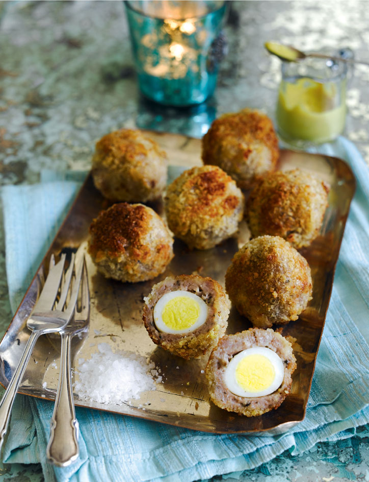 2. Divide the sausage meat into 12 equal portions. With lightly floured hands, form a portion into a patty about 6.5cm (2½in) across in the palm of one hand. Put a boiled quails’ egg in the middle, then shape the meat around it. Set aside on a board and repeat with the remaining eggs and sausage meat.